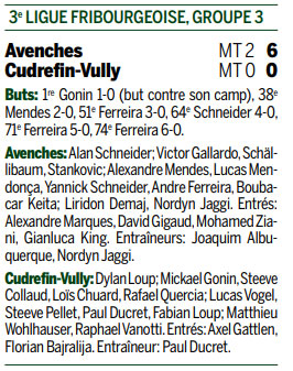 Après trois défaites d’entrée, les Avenchois tournent désormais à plein régime. Ils ont décroché une septième victoire de rang toutes compétitions confondues, vendredi dernier à domicile. Un Cudrefin diminué n’a pas fait le poids.