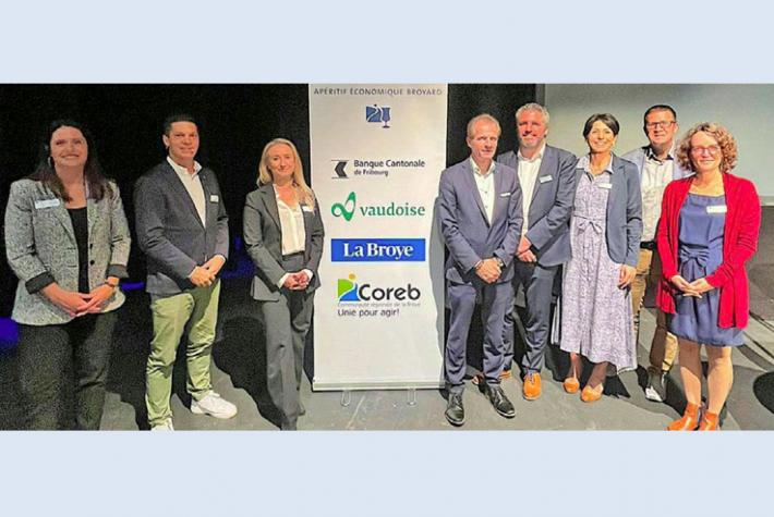 A gauche, les animateurs de la soirée, Elodie Crausaz (journaliste et présentatrice), Marc-André Berset (directeur de la communication à Fribourg-Gottéron et du championnat du monde de hockey sur glace organisé en 2026 à Fribourg) et Cindy Reymond (secrétaire générale de l’association Euro féminin 2025 à Genève. A droite, les organisateurs Stéphane Niklaus (directeur régional à la BCF), Philippe Charmoy (Vaudoise Assurances), Christel Losey Mosimann (secrétaire régionale à la Coreb), Lionel Conus (secrétaire régional à la Coreb) et Delphine Francey (rédactrice en cheffe de La Broye Hebdo).