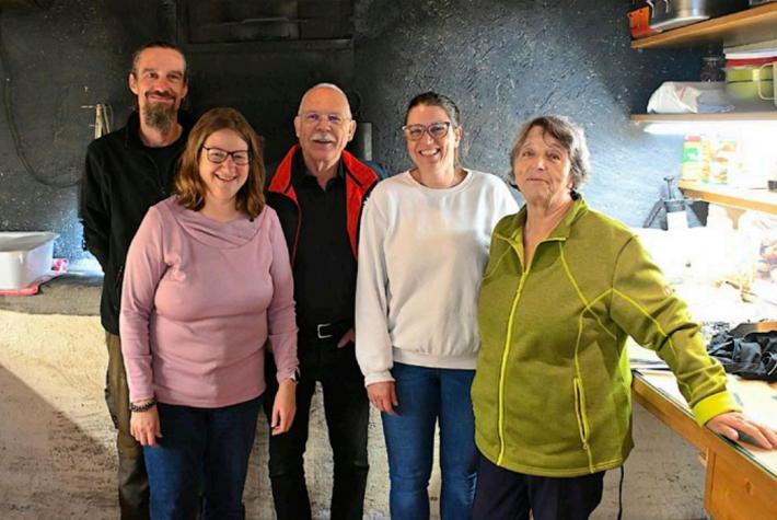 Quelques membres des Mil et une miches (de g. à dr.: Julien Mottet, Audrey Butikofer, Jean-Charles Estermann, Vanessa Mottet et Claire-Lise Jaccaud) ont organisé leur Nuit du vin cuit le week-end dernier, entre l’église et leur four à pain. PHOTO GAËTAN MOTTET